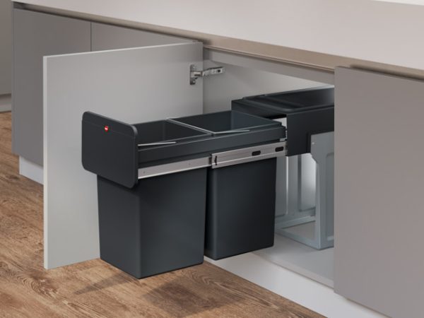 פח אשפה מגירה מחולק שחור לתוך ארון מטבח EcoLine design L מכסה שמאפשר לאחסן חפצים מעל הפח,כולל 2 מיכלים פנימיים…