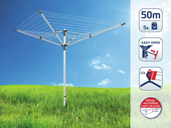מהיר וקל לפתיחה באמצעות חוט המשיכה לתלית 50 מטר, כ-5 משאות כביסה ניתן לקבוע את גובה המתקן מ-85 ל-180 ס"מ…